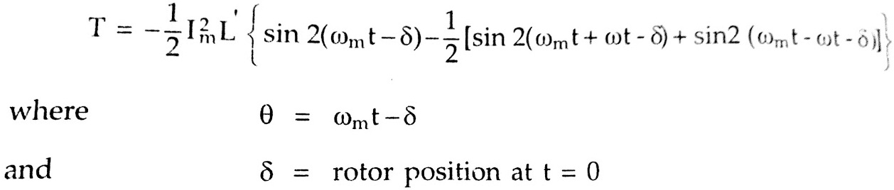 The above equation gives instantaneous torque produced. The average torque is zero as the average of each term in the above equation is zero. The value of torque is not zero when ω = ωm at this condition the magnitude of the average torque is,